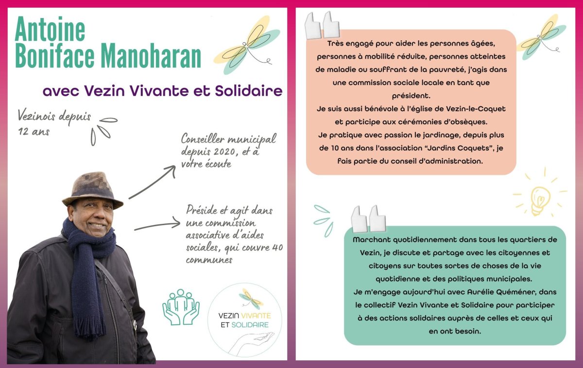 La Solidarité assurant la dignité de toutes et tous : nous ferons de Vezin une ville plus juste et accueillante où chacun, du plus jeune au plus ancien aura accès aux écoles, à la culture, en fonction de ses besoins et de ses envies, vivra dans un logement confortable et bénéficiera d’une offre de commerces, de services, d’artisans, digne d’une ville de plus de 6 000 habitant.es. !